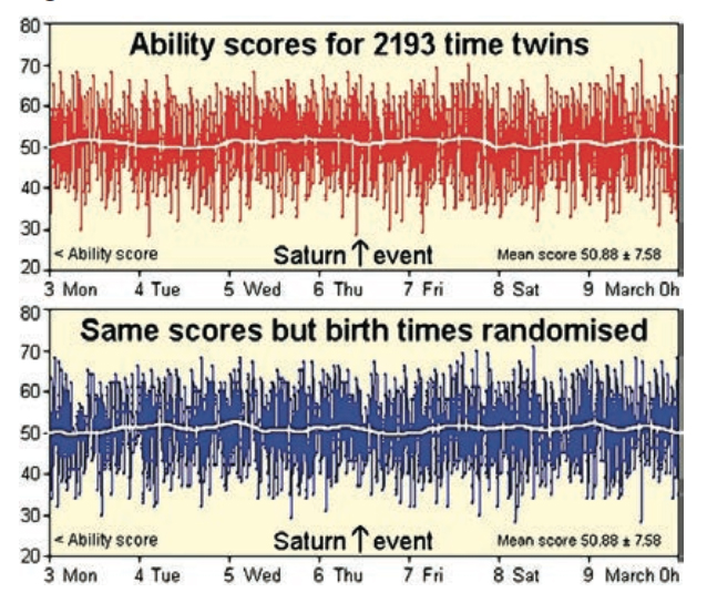 But for astrology itself the results were a nightmare: support for astrological claims was nowhere in sight. For example, Saturn sets every day momentarily exactly on the horizon, a position traditionally held to greatly boost its strength. At that time in London on March 6, 1958, it was also square the Moon within 0.1Âș, which is also held to boost its strength. It was not just a strong Saturn event; it was also the strongest Saturn event for the entire week. Saturn is held to indicate restriction and limitation, so its effect should show up as a dip in measures of ability. But it did not (see Figure 4).
