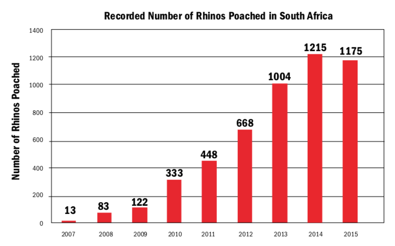 While the trade in rhino horn is banned under the Convention on International Trade in Endangered Species of Fauna and Flora (CITES), the black market fueled by demand particularly from China and Vietnam is lucrative and primarily recent. In 2005, according to the organization Save the Rhino International, about sixty rhinos were killed for their horns or as trophies in Africa. Since then, more than 7,000 have been killed, with 1,346 in 2015 alone (Poaching in numbers 2017). In South Africa alone, poaching increased 9,000 percent from thirteen in 2007 to 1,215 in 2014 (Juskalian 2017; Save the Rhino International 2018).