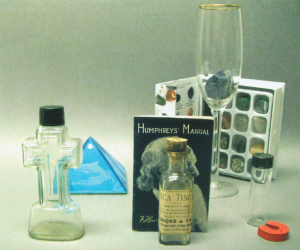 and vial for creating âmagneticâ water. Back row: New Age pyramid for making pyramid-âenergizedâ water; and a goblet with a mineral and set of âHealing Stonesâ for making âgem-informedâ water. (Authorâs photo: items from his collection; healing stones gift of Barry Karr.)