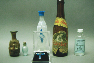 water intended to be used talismanically); ca. 1930 amber bottle for White Rock Mineral Springs water; and a mid-twentieth century souvenir bottle of water from the pseudo Fountain of Youth in St. Augustine. (Authorâs photo: items from his collection.)