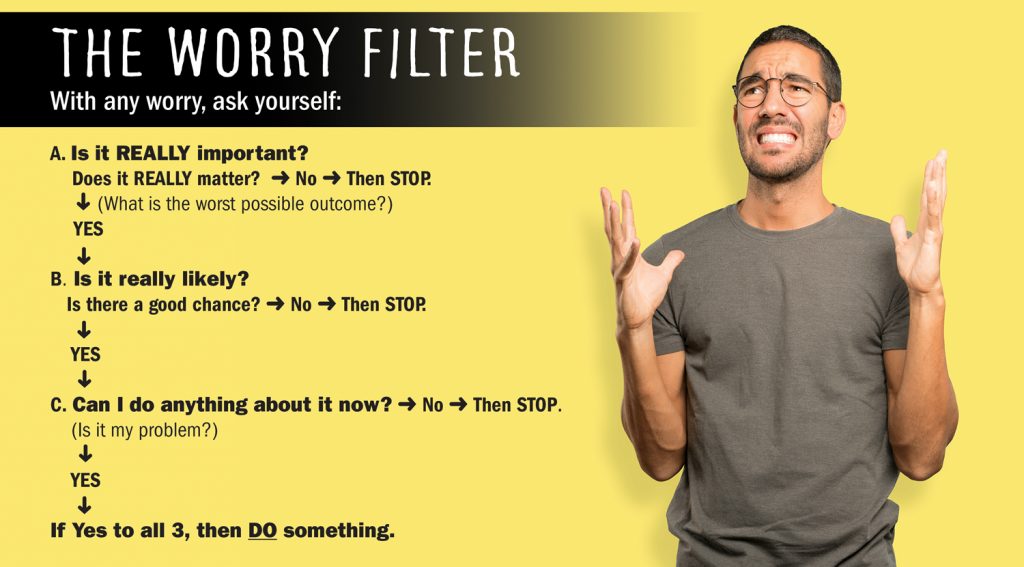 This filter sorts out four types of worries: (a) Ones that actually don’t matter enough to waste worry time and energy on, but this doesn’t stop you; (b) ones that are too unlikely to happen to justify your discomfort; (c) ones that you can’t do anything about anyway; and (d) worthwhile worry targets. Our automatic mental flow chart filters that identify these categories leave us either aware we need to “drop it and move on” (this can be easier said than done, and sometimes I will coach better “thought-stopping” to help) or with an injunction to “not just sit there but do something!”
