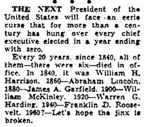 And the first published account to ascribe the deaths to an actual hex may not have appeared until November 1940 when the syndicated cartoonist John Hix wrote, “The man who attains the executive chair for the next four years faces the jinx of a 100-year-old ‘curse,’ for death in office has come to every President elected at 20-year intervals since 1840” (Hix 1940). In February 1960, the journalist Ed Koterba similarly noted, “The next President of the United States will face an eerie curse that for more than a century has hung over every chief executive elected in a year ending with zero” (Koterba 1960). Still, neither Hix nor Koterba referenced the tale of Tenskwatawa.