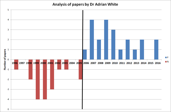 I conducted a Medline search of White’s publications on acupuncture and selected those articles that reported factual new data. The endpoints for my analysis were the directions of the conclusions of White’s papers. I therefore extracted, dated, and rated the conclusions of the included articles as follows: