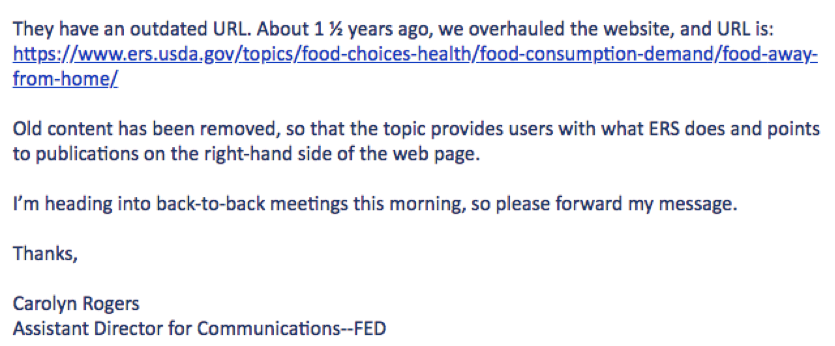Incidentally, one part of Ms. Rogers’s email is quite accurate. Most of what remains on the “Food-Away-from-Home” webpage describes the functions of the Economic Research Service. There is almost no information about food purchased or consumed away from home remaining on the page.