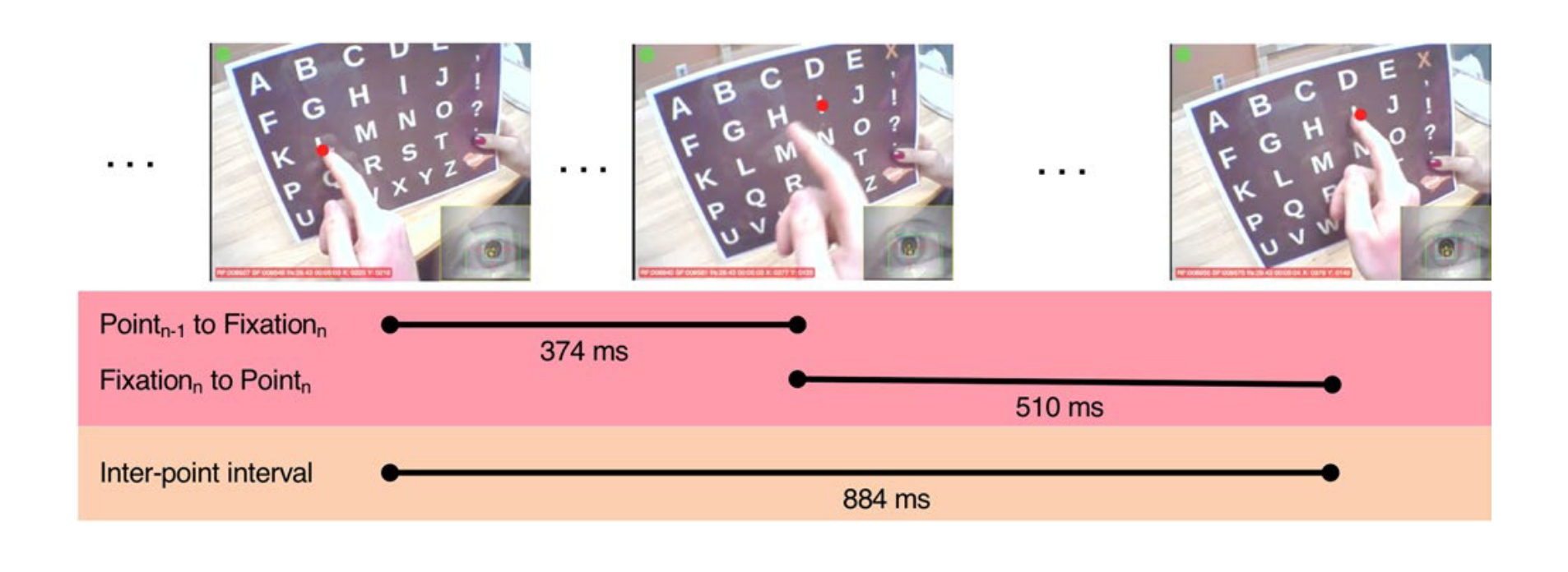 The goal of the experimentâwhich was achievedâappears to have been to demonstrate that the participantsâ eye movements anticipated the next letter in a word. As depicted in Figure 3, the authors aimed to measure both the finger movements and eye movements of the participants to show the following sequence: fixation of both eye and finger on letter n-1 (âLâ), fixation of eye on letter n (âIâ) with finger in the air, and fixation of both eye and finger on letter n (âIâ). The videos produced by the eye movement software were the raw data that was subsequently scored by two coders who recorded finger taps and the location of the eye-gaze based on the movement of the red dot.Â